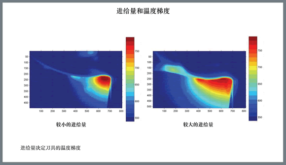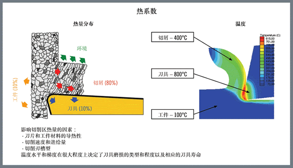 工件材料的不同導(dǎo)熱性以及其他加工因素,都會對熱量的分布產(chǎn)生顯著影響。例如,高溫合金的導(dǎo)熱性較差。當加工導(dǎo)熱性較差的工件時,傳入刀具的熱量會增加。此外,加工硬度較高的材料會比加工硬度較低的材料產(chǎn)生更多熱量。在通常情況下,更高的切削速度會增加熱量的產(chǎn)生,而更高的進給量會加大切削刃中受高溫影響的區(qū)域。