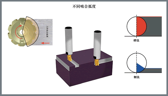 不同銑削工藝的嚙合弧也不同。例如在槽銑中,工件材料在加工過程中包圍一半的刀具;嚙合弧是刀具直徑的 100%。切削刃一半的加工時間都花在切削上,因此熱量迅速積聚。這種情況與側(cè)銑不同,在側(cè)銑中,任何時候都只有相對較小的刀具部分與工件嚙合,并且切削刃有更多的機會向空氣中散熱。
